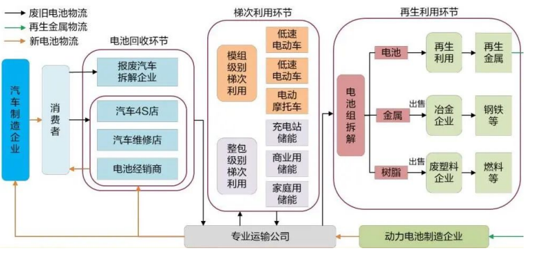從產(chǎn)業(yè)鏈角度來講,動(dòng)力電池回收與綜合利用行業(yè)分為梯次利用產(chǎn)業(yè)鏈和再生利用產(chǎn)業(yè)鏈。當(dāng)動(dòng)力電池容量衰減至初始容量的80%以下時(shí),電池或不再適合電動(dòng)汽車使用,但可在儲能系統(tǒng)(電網(wǎng)調(diào)峰調(diào)頻、削峰填谷、風(fēng)光儲能等)、低速電動(dòng)工具等場景中實(shí)現(xiàn)二次利用,即梯次利用;當(dāng)電池容量衰減至初始容量的40%以下時(shí),則可通過拆解回收,提取其中的鋰、鈷、鎳等高價(jià)值金屬材料,實(shí)現(xiàn)資源再生利用。所以梯次利用產(chǎn)業(yè)鏈的上游主要為電池材料企業(yè),中游包括電池生產(chǎn)制造企業(yè)、儲能企業(yè)、電池綜合服務(wù)企業(yè),下游則是電池再利用領(lǐng)域的通信企業(yè)、低速電動(dòng)生產(chǎn)企業(yè)等;對于再生利用產(chǎn)業(yè)鏈,其上游主要是電池生產(chǎn)制造企業(yè),中游是提供回收渠道的物流企業(yè)、環(huán)保企業(yè)及電池檢測企業(yè),下游則是電池材料企業(yè)。