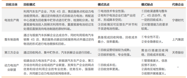 目前該模式下的典型代表企業(yè)是寧德時(shí)代,其收購了廢舊電池循環(huán)利用企業(yè)廣東邦普循環(huán),已初步構(gòu)建“電池生產(chǎn)-消費(fèi)/使用-梯次利用-回收與資源再生”的產(chǎn)業(yè)閉環(huán),為其提高對上游電池原材料企業(yè)的議價(jià)能力、降低動(dòng)力電池生產(chǎn)成本創(chuàng)造有利條件。