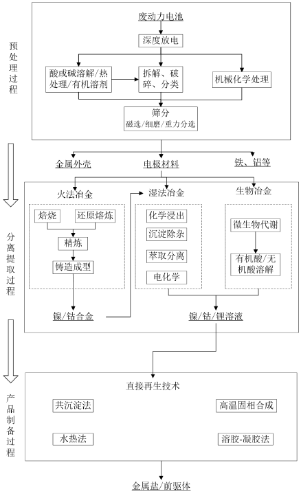 動(dòng)力電池拆解回收,即將廢舊電池進(jìn)行物理或化學(xué)拆解,提取其中的金屬或化合物,進(jìn)行精煉或再生利用。不同于廢舊電池梯次利用存在商業(yè)化進(jìn)展緩慢,經(jīng)濟(jì)性、安全性面臨較大挑戰(zhàn)等問題,動(dòng)力電池拆解回收工藝已經(jīng)較為成熟,主要可以分為預(yù)處理、分離提?。ㄉ疃忍幚恚?、產(chǎn)品制備等過程。